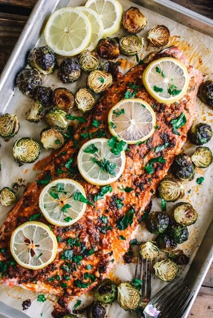 Sheet Pan Meal with Lemon, Brussels Sprouts, Salmon, Grape Tomatoes, Red Onion